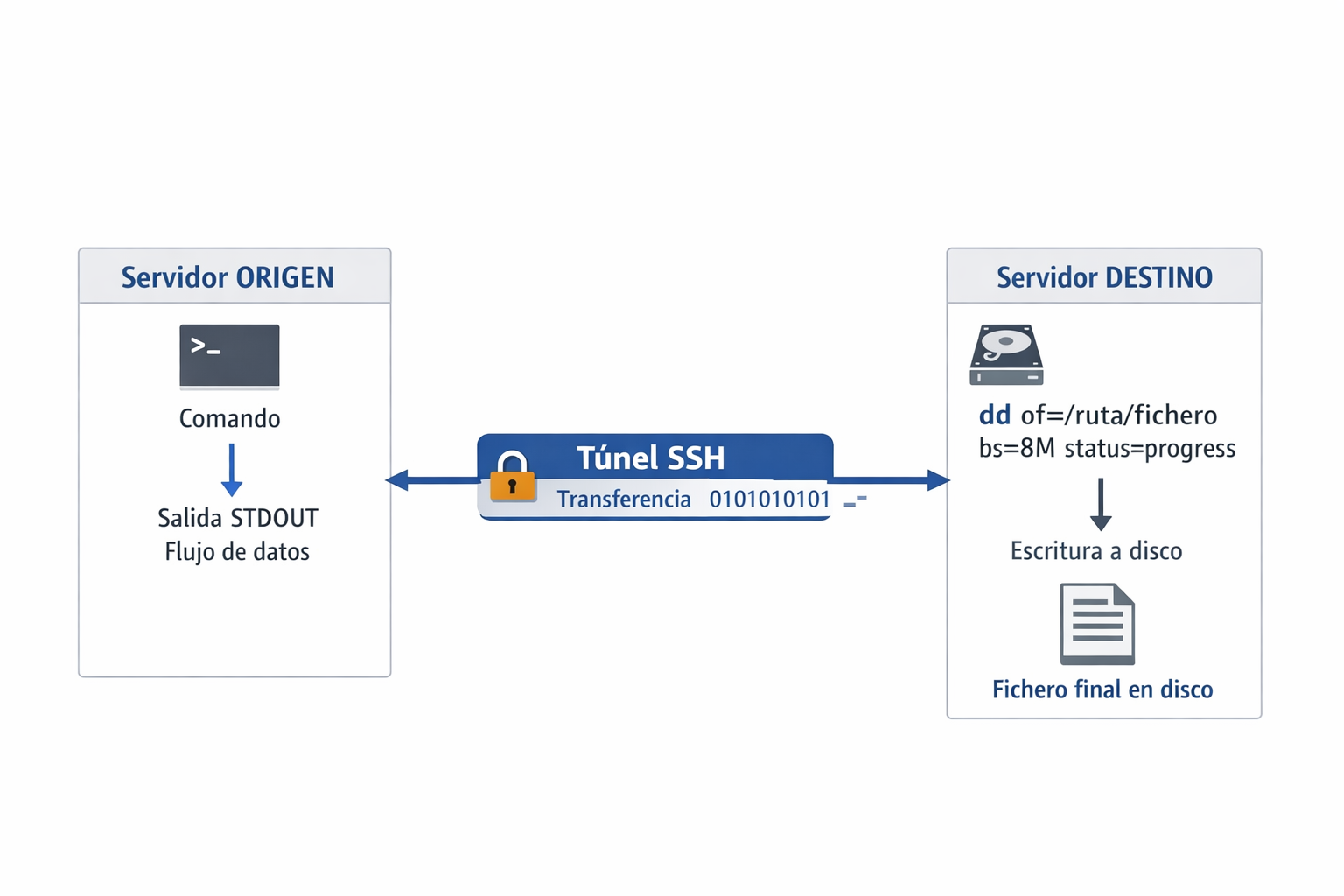 comando (stdout) → túnel SSH → dd → fichero final en destino